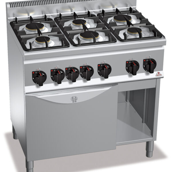 • Palniki: 3x 2,8 kW o średnicy 90 mm, 3x 3,4 kW o średnicy 120 mm• Powierzchnia robocza ze stali nierdzewnej AISI 304• Palniki z żeliwa stopowego aluminiowego i mosiądzu z talerzami palnikowymi ze stopu odpornego na płomień, włączane zaworowym kranikiem, wodoszczelne i umieszczone na stalowej powierzchni AISI 304• System zabezpieczający z termoparą• Piekarnik gazowy o mocy 3,5 kW• Wsad piekarnika: GN 1/1 530x325 mm, 3 poziomy• Gazowy piekarnik statyczny całkowicie wykonany ze stali nierdzewnej, 3 poziomy wsporników dla rusztów/form do pieczenia GN 1/1• Drzwi oraz ich część wewnętrzna wykonane ze stali nierdzewnej• Uchwyt drzwi odporny na wysoką temperaturę, wykonany ze stali nierdzewnej, grubość 20/10• Nogi nastawne• Wyposażenie standardowe (posiada): 1 ruszt zapobiegający przechyłom• Wyposażenie opcjonalne (za dopłatą): drzwi do szafki