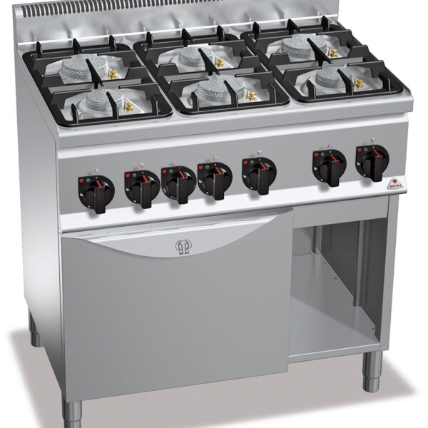• Palniki: 3x 3,5 kW o średnicy 90 mm, 3x 6 kW o średnicy 120 mm• Powierzchnia robocza oraz panele przednie wykonane ze stali stali nierdzewnej AISI 304• Palniki wykonane całkowicie z żeliwa, z dożywotnią gwarancją, włączane zaworowym kranikiem, wodoszczelne i umieszczone na stalowej powierzchni AISI 304, dogłębnie tłoczone• Model jest wyposażony w termoparę awaryjną oraz w płomień pilotujący, chroniony osłoną z mosiądzu w celu łatwego czyszczenia i konserwacji• Piekarnik gazowy o mocy 3,5 kW• Wsad piekarnika: GN 1/1 530x325 mm, 3 poziomy• Gazowy piekarnik statyczny całkowicie wykonany ze stali nierdzewnej, 3 poziomy wsporników dla rusztów/form do pieczenia GN 1/1• Drzwi oraz ich część wewnętrzna wykonane ze stali nierdzewnej• Uchwyt drzwi odporny na wysoką temperaturę, wykonany ze stali nierdzewnej, grubość 20/10• Wyposażenie standardowe (posiada): 1 ruszt zapobiegający przechyłom• Wyposażenie opcjonalne (za dopłatą): drzwi do szafki• Nogi nastawne