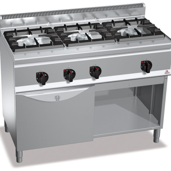 • Palniki: 1x 7 kW dwukoronowy o średnicy 108 mm, 2x 12 kW dwukoronowe o średnicy 130 mm• Powierzchnia robocza ze stali nierdzewnej AISI 304• Palniki z dożywotnią gwarancją, wykonane całkowicie z niklowanego żeliwa, z pojedynczą i podwójną koroną o dużej mocy, włączane zaworowym kranikiem, z termoparą awaryjną oraz płomieniem pilotującym• Ruszty z żeliwa• Wysuwany zbiornik zapewniający maksymalną higienę oraz łatwą konserwację• Piekarnik gazowy o mocy 3,5 kW• Wsad piekarnika: GN 1/1 530x325 mm, 3 poziomy• Gazowy piekarnik statyczny całkowicie wykonany ze stali nierdzewnej, 3 poziomy wsporników dla rusztów/form do pieczenia GN 1/1• Drzwi oraz ich część wewnętrzna wykonane ze stali nierdzewnej• Uchwyt drzwi odporny na wysoką temperaturę, wykonany ze stali nierdzewnej, grubość 20/10• Nogi nastawne• Wyposażenie standardowe (posiada): 1 ruszt zapobiegający przechyłom• Wyposażenie opcjonalne (za dopłatą): drzwi do szafki/podstawy