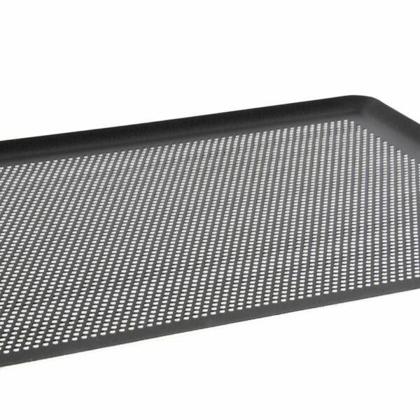 Aluminium pokryte powłoką non-stick. Perforowane dno pozwala uzyskać efekt chrupiącego, kruchego spodu wypieku. Wypiek nie przywiera do blachy. Łatwa w myciu.