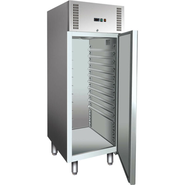 Szafa chłodnicza:• Nowoczesna technologia• Obudowa i komora chłodząca wykonana ze stali nierdzewnej• Elektroniczny sterownik z wyświetlaczem temperatury• Automatyczne odparowanie skroplin• Regulowane nóżki ze stali nierdzewnej• Samodomykające się drzwi z zamkiem na klucz• Profilowany uchwyt drzwi• W komplecie 10 prowadnic pod blachy 600x400• Wymuszony obieg powietrza