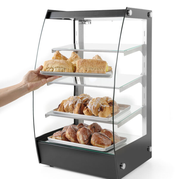 • Idealna do stacji benzynowych, małych sklepików, kuchni biurowych, kantyn i stołówek do prezentowania wszelkich dań nie wymagających specjalnych warunków przechowywania jak np. cukierki w paczkach, kruche ciasteczka, drożdżówki itp.• Zasilanie 230 V oraz kompaktowa budowa sprawiają, że witrynę można ustawić praktycznie wszędzie• Pojemność komory 75 litrów• Oświetlenie LED umieszczone na górze sterowane podświetlonym włącznikiem• Obudowa wykonana ze stali nierdzewnej oraz hartowanego, bezpiecznego szkła• Pięć powierzchni ekspozycyjnych:-Malowane na czarno stalowe dno komory z pokryciem szklanym: 390 x 325 mm-Dolna szklana półka: 365 x 250 mm-Środkowa szklana półka: 365 x 230 mm-Górna szklana półka: 360 x 195 mm-Malowana na czarno stalowa góra witryny: 393 x 325 mm• 3 przestawne szklane półki, nachylone pod lekkim kątem w stronę klienta• 8 możliwych ustawień półki• Odległość między poziomami 45 mm• Boczne szyby o grubości 5 mm• Brak przedniej szyby umożliwia samoobsługę• Tylne szklane drzwi zamykane na magnes z zawiasem po prawej stronie• Brak możliwości zamiany otwierania drzwi• Praktyczna dolna wnęka o wymiarach 260 x 320 x 85 mm, np. na zapas prezentowanego towaru• 4 gumowe, nieregulowane nożki: wysokość 15 mm• Przewód elektryczny o długości 1650 mm wraz z wtyczką na 230 V z uziemieniem
