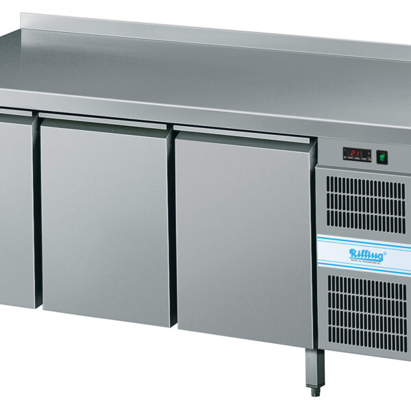 Stół chłodniczy piekarniczy, 3-drzwiowy z własnym chłodzeniem 580 l, bez blatu:• Dostosowane do blach piekarniczych EN 400x600• Korpus wykonany w całości ze stali nierdzewnej z blatem zagiętym w górę C• Wysokość korpusu: 650 mm• Temperatura od 0 do +12 ° C• Urządzenie gotowe do podłączenia z wymuszonym obiegiem powietrza• Parownik umieszczony na górze wewnątrz urządzenia • Automatyczne odszranianie i odparowanie kondensatu za pomocą gorącego gazu• Sterowanie elektroniczne z wyświetlaczem cyfrowym• Higieniczne wykonanie• Wymiary: 1950x800x850 mm• Pojemność: 580 l• Zasilanie: 400 W / 230 V• Moc chłodnicza: 346 W temp. odpar. -15°C, max. temp. otoczenia +40°C • Klasa energetyczna: B• Czynnik chłodniczy: R290• Zużycie energii: 2,45 kWh / 24 h• Wyposażenie standardowe: 15 par prowadnic przestawnych co 54 mm• Wyposażenie opcjonalne (dodatkowa opłata): blacha piekarnicza (A700 081), para prowadnic (A700126), 4 kółka, 2 z hamulcem (A700061), blat granitowy typ A bez rantu tylnego (A705 010)• Zdjęcie poglądowe, cena dotyczy stołu chłodniczego bez blatu