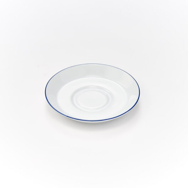 ●spodek 150 mm do filiżanki 200 ml Bistro ●porcelana biała, niebieski rant ●można myć w zmywarce i używać w mikrofali ●cena za sztukę ●pakowane po 6 szt