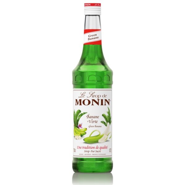 Banany są zawsze zbierane zielone. Żółkną podczas dojrzewania w drodze na rynek. Zielone banany to owoce, które nie zdążyły dojrzeć i zżółknąć. Zielone banany mają „zielony" posmak przypominający kiwi. Są lekko słodkie i sztywne. Spróbuj zielonego banana firmy MONIN, a odkryjesz smak prawdziwych niedojrzałych bananów, jakże odmienny od smaku żółtych. BARWA: Przezroczysta, żywo zielona SMAK: Bukiet niedojrzałych bananów, bogaty i wyrazisty smak banana ZASTOSOWANIA: Kawy, koktajle, milkshake'i, kakao, napoje deserowe, smoothies, piwa, poncze owocowe