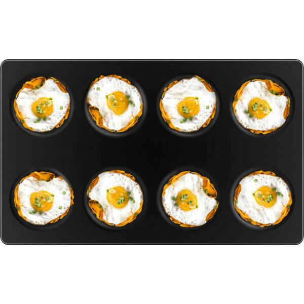 • aluminiowa blacha pokryta teflonem przeznaczona do smażenia jajek, racuchów i placków itp. • zagłębienia sprawiają, że produkty charakteryzują się jednakowym kształtem i wielkością