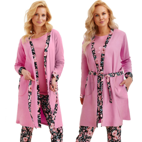 Piękny szlafrok damski wykonany z miękkiej bawełny w kolorze różowym. Kwieciste wstawki dodają temu modelowi lekkości. Klasyczny fason idealnie sprawdzi się jako homewear. Szlafrok wiązany paskiem, dzięki czemu figura jest ładnie podkreślona. Rękawy długi
