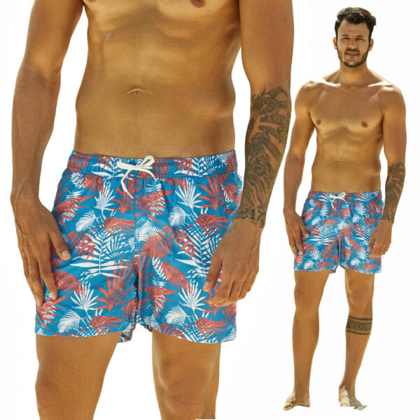 Designerskie kąpielówki męskie wykonane z wzorzystej tkaniny. Ciekawy wzór podkreśla barwna kolorystyka z elementami bieli, koralu i niebieskiego. Pas z gumką i regulacją na sznurek wewnątrz pozwala na indywidualne dopasowanie wielkości. Luźny, sportowy krój - szorty świetnie sprawdza się zarówno podczas wypoczynku na plaży, jak i treningów na basenie.