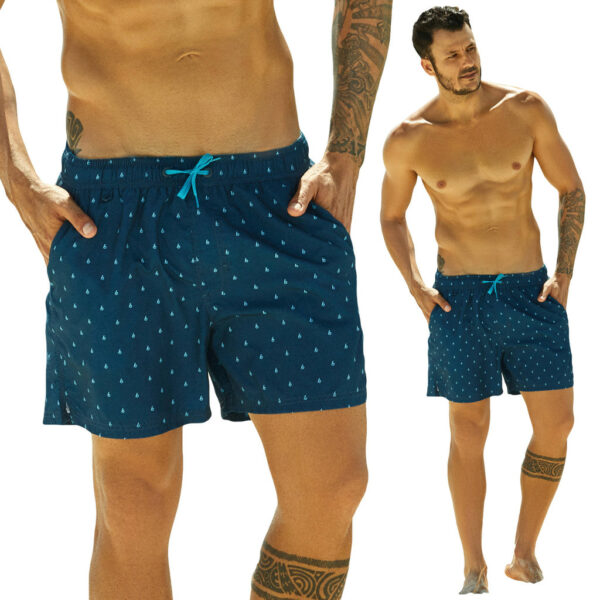 Kąpielówki męskie w kolorze granatowym firmy Henderson. Delikatny wzór żaglówki. Luźny, komfortowy krój (boardshorty). W pasie guma oraz sznurek umożliwiający regulację obwodu, po bokach dwie kieszenie. Od wewnętrznej strony podszewka z siateczki zapewniająca najwyższy komfort podczas noszenia. Idealne na plażę i basen.