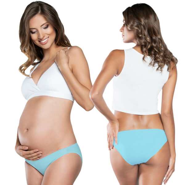 Te majtki damskie to idealny model dla kobiet w ciąży. Wygodny fason fig, bezuciskowe - zamiast gumki z przodu mają szeroki, wygodny pas z dzianiny. Kolor: mięta. Stan materiałowy: 95% bawełna 5% elastan.