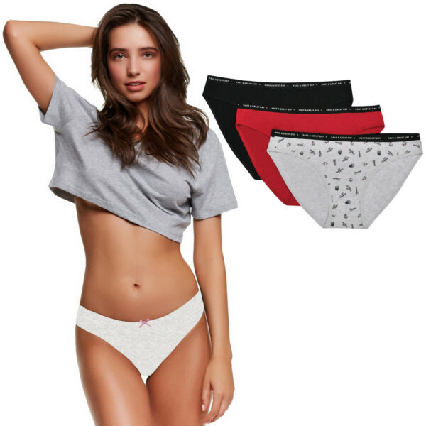 Zestaw trzech par fig damskich marki Henderson o kroju bikini. Figi wykonane są z wysokiej jakości bawełny, a dodatek elastanu sprawia, że idealnie dopasowują się do sylwetki. W pasie płaska guma z napisem "HAVE A GREAT DAY". Wykonane z dbałością o każdy szczegół. Model dla Pań ceniących oryginalność i swobodę ruchu. W zestawie 3 sztuki (widoczne na zdjęciu). Skład: 95% bawełna 5% elastan.