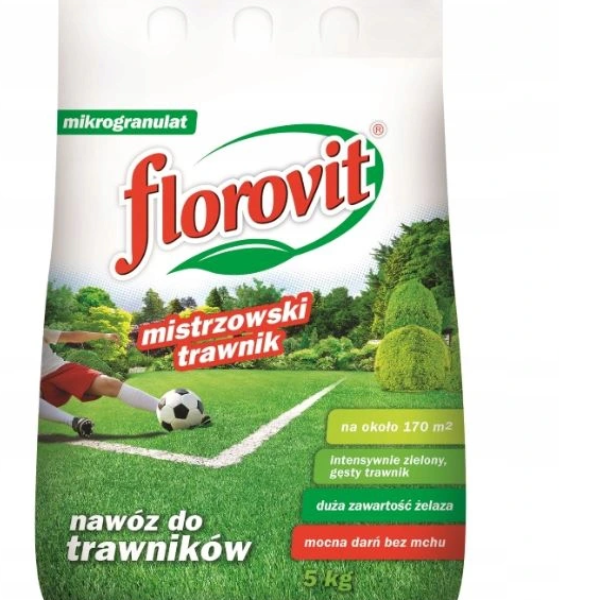 FLOROVIT - NAWÓZ MISTRZOWSKI TRAWNIK DO TRAWNIKÓW Z MCHEM 5KG WOREKzwiększa zawartość darni i pobudza krzewieniezapewnia zieloną barwę trawnika chroni trawnik przed mchemOpis:Florovit nawóz "Mistrzowski trawnik" dzięki zawartym w odpowiednich ilościach składnikom mineralnym zapewnia lepszą kondycję trawnika. Gwarantuje lepszą zdrowotność trawnika, stymuluje trawę do wzrostu oraz zapewnia intensywną barwę. Dzięki wysokiej zawartości azotu sprawia, że darń staję się zwarta i silna, zwiększa krzewienie traw oraz przeciwdziała wzrostowi mchu i chwastów. Skład: Nawóz NPK (MgO + SO3) 16,0 - 5,2 - 5,2 (3,0 + 26,0) z żelazem16,0% (N) azot całkowity4,7% (N) azot azotanowy11,3% (N) azot amonowy5,2% (P2O5) pięciotlenek fosforu rozpuszczalny w obojętnym roztworze cytrynianu amonu i wodzie3,4% (P2O5) pięciotlenek fosforu rozpuszczalny w wodzie5,2% (K2O) tlenek potasu rozpuszczalny w wodzie3,0% (MgO) tlenek magnezu całkowity26,0% (SO3) trójtlenek siarki całkowity4,0% (Fe) żelazo całkowiteStosowanie:Zaleca się stosować nawóz w okresie od wiosny do końca sierpnia. Zabieg można powtórzyć z zachowaniem 3 tygodniowych odstępów.Dawkowanie:30g/ m²Po wykonanym zabiegu trawnik intensywnie podlać wodąOpakowanie: 5kg