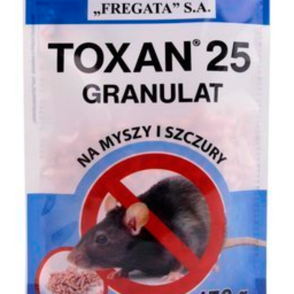TOXAN 25 GRANULATeliminuje szczury i myszyw postaci granulatudo stosowania wewnątrz i na zewnątrzOpisToxan 25 to gryzoniobójczy preparat w postaci granulatu do zwalczania szczurów i myszy. Środek gotowy do użycia, skutecznie eliminuje szkodniki. Trutkę należy rozłożyć w miejscach występowania gryzoni. Efekty zauważalne już po 4-6 dniach. Toxan 25 można stosować zarówno wewnątrz jak i na zewnątrz.DawkowanieGranulat Toxan należy umieszczać w miejscach występowania gryzoniMyszy: 50-100g przynęty na stację deratyzacyjnąSzczury: 150-200g przynęty na stację deratyzacyjnąSubstancja aktywnabromadiolon 0,0025% (0,0025g/100g)Produkt biobójczy należy używać z zachowaniem środków ostrożności. Przed każdym użyciem należy przeczytać etykietę i informacje dotyczące produktu.
