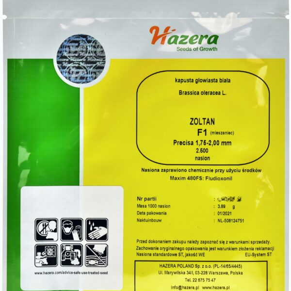 KAPUSTA GŁOWIASTA BIAŁA ZOLTAN F1 2.5 tys. nas. prec. 1,75-2,00 (STD) NASIONAnajnowsza odmiana kapusty późnej od firmy Hazerałatwa w uprawieodporna na Fusafium i na XanthomonasGłówne cechy odmianyOkres wegetacji: 140 dniTyp uprawy: w grunciePrzeznaczenie: do długiego przechowywaniaProponowane zagęszczenie: 25-30 tysięcy szt./haCharakterystyka owocuKształt owocu: główki kuliste, wnętrze jest bardzo zbite z cienkimi liśćmi i krótkim głąbem. Masa główki: 3-4 kg Odporność: wykazuje odporność na Fusarium i na XanthomonasTendencja: dobrze znosi wysokie temperatury i letnie okresy suszy dając najwyższe plonyInne: nawet w czerwcu po przechowywaniu, główki kapusty wyglądają świeżo, ponieważ liście zewnętrzne mają żywo zielony kolor.Opakowanie: 2500 nasion
