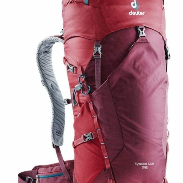 Opis produktu: Plecak Deuter Speed Lite 26 to model w którym w celu wsparcia stabilizacji zastosowano elastyczny stelaż Delrin®. Sprawia to, że całą konstrukcja jest odpowiednio usztywniona, co odpowiada za większy komfort wędrówki. Takie rozwiązanie opiera się na ramie w kształcie odwróconej litery U,co doskonale sprawdza się na szlaku. W plecaku Deuter Speed Lite 26 zastosowano piankę 3D-Air Mesh, która amortyzuje wagę pakunku, a także odpowiada za efektywne wentylowanie odcinka pleców. Pasy biodrowe plecaka oraz jego szelki zostały wykonane z oddychającej i przyjemnej pianki 3D Air Mesh, która dobrze amortyzuje wagę tego modelu. Głównym zadaniempasa biodrowego jest podtrzymanie plecaka i eliminowanie wstrząsów, w mniejszym stopniu ma przenosić ciężar z pleców na biodra. Plecy w całości pokryto siateczką ułatwiającą cyrkulację powietrza,co ułatwi zachowanie komfortowego suchego klimatu. Plecak Deuter Speed Lite 26 posiada obszerną komorę główną z nadrukowaną instrukcją wzywania pomocy oraz z przegrodą na bukłak do pojemności 3 litrów.Przy plecach obok szelek znajduje się mała kieszonka na cenne przedmioty. Na przednim panelu mamy możliwość podczepienia elastycznej siatki, dzięki której przytroczymy kask czy kurtkę.Plecak wyposażono w odblaskowe elementy zwiększające nasze bezpieczeństwo na drodze.Plecak Speed Lite 26 wykonany został z lekkiej wersji materiału nylonowego Nylon Pocket Rip (100D PA). Cienka przędza jest niesamowicie lekka,a bardzo ciasny splot sprawia, że materiał jest wyjątkowo odporny na ścieranie i rozdarcie. Parametry techniczne: • Wyściełany system nośny pokryty oddychająca tkaniną 3D Air Mesh.• Napinający i elastyczny pręt Delrin z włókna szklanego w kształcie odwróconej litery U, odpowiedzialny za zachowanie właściwego kształtu i elastyczności plecaka Wyjmowany po to by móc dodatkowo zmniejszyć wagę (w modelach Speed Lite: 22 SL, 24, 24 SL, 26, 30 SL, 32).• Zdejmowany pas biodrowy i piersiowy (w modelach Speed Lite: 22 SL, 24, 24 SL, 26, 30 SL, 32)• Anatomicznie uformowane pasy nośne w modelach Speed Lite 12 i 16 zbudowane z tkaniny 3D Air Mesh. W modelach 20 i większych dodatkowo wypełnione pianką dla lepszego komfortu przy noszeniu cięższych rzeczy• Możliwość zastosowania bukłaka o maks. pojemności 3 l• Wyścielany pas biodrowy z kieszeniami na zamki• Elementy odblaskowe zwiększające widoczność• Pętle i gumki ze stoperami na czekan i kije• Uchwyty na Helmet Holder• Instrukcja SOS• Wymiary: 63 x 27 x 22 cm• Waga: 830 g