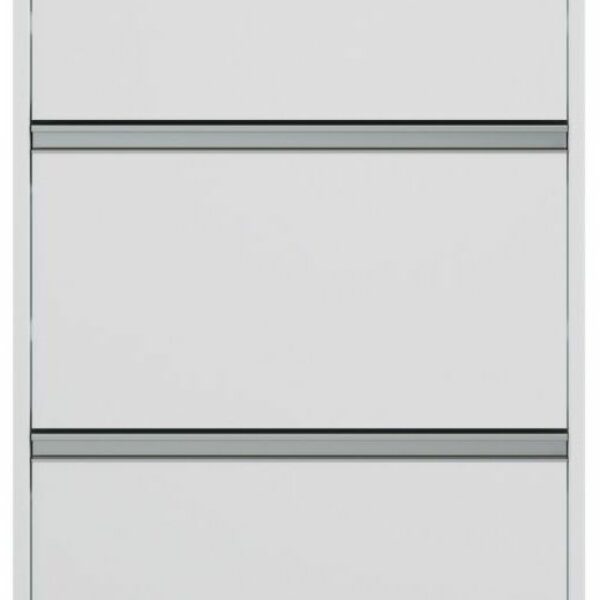 Prostokątna szafka na buty ma wymiary 62,6 x 110,8 x 18 cm (wymiary podawane w kolejności: szerokość x wysokość x głębokość). Zapewnia to wystarczającą ilość miejsca na obuwie. Biel całości przepięknie łączy się z lekko ciemniejszymi uchwytami, które podkreślają kształt szafki. Ta biała szafka na buty została wyposażona w 3 mniejsze szafki, w których spokojnie zmieścimy nasze obuwie.