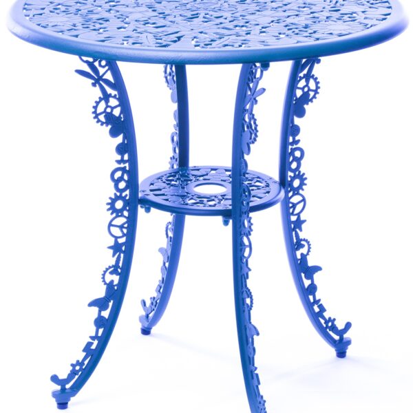 mebel świetnie nadaje się bowiem również do użytku zewnętrznego.Stoły Industry dostępne są w kilku wariantach – tutaj niebieski stół aluminiowy z okrągłym blatem o średnicy 70 cm.