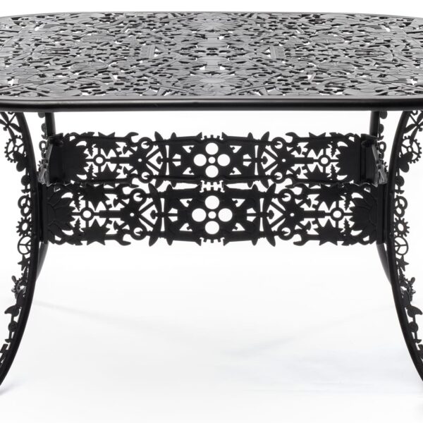 również do użytku zewnętrznego.Stoły Industry dostępne są w kilku wariantach – tutaj czarny stół aluminiowy z owalnym blatem o wymiarach 152×90 cm.