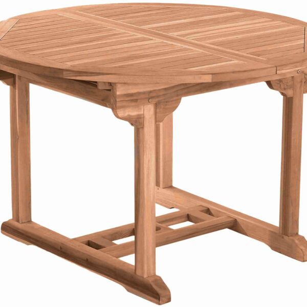 Skandynawski stół Inezza to projekt, który przypadnie do gustu głównie fanom prostych form. W całości wykonany jest on z lakierowanego drewna tekowego w naturalnym kolorze. Dopatrzeć się można różnych odcieni, jednak wynika to ze specyfiki produktu i jest całkowicie normalne. Solidne, grube nogi o okrągłym przekroju łączą się z podstawą, która zapewnia stabilność konstrukcji. Drewniany stół Inezza o wysokości 75 cm wyróżnia się geometrycznym kształtem - jego blat o średnicy 120 cm ma formę koła. Mebel ten posiada także możliwość rozłożenia, dzięki czemu zyskuje się większą powierzchnię użytkową - aż do 170 cm szerokości.
