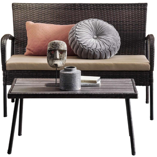 Ten czteroelementowy zestaw mebli składa się z dwóch foteli o wymiarach 58 × 68 × 78 cm, dwuosobowej sofy ogrodowej 115 × 68 × 78 cm oraz stolika kawowego 81 × 46 × 42 cm (szerokość x głębokość x wysokość). Pleciony zestaw ogrodowy Toshame wykonany został z technorattanu - tworzywa sztucznego imitującego naturalny rattan - w kolorze głębokiego brązu. To właśnie z tego rodzaju poliuretanu wykonane zostały przeplatane siedziska, oparcia, a nawet nogi i podłokietniki mebli. Wśród elementów zestawu Toshame wyróżnia się stolik ogrodowy, którego blat wykonany został z tworzywa sztucznego imitującego naturalne deski. Dodatkowo, w celu podniesienia komfortu użytkowania, meble zostały wyposażone w tapicerowane beżową tkaniną poduszki. Jeśli szukasz mebli ogrodowych odpornych na działanie niekorzystnych temperatur i wody, technorattanowy zestaw Toshame sprawdzi się w każdych warunkach. Imituje on meble z naturalnych surowców, lecz łatwiej pozbyć się z niego plam i zabrudzeń.