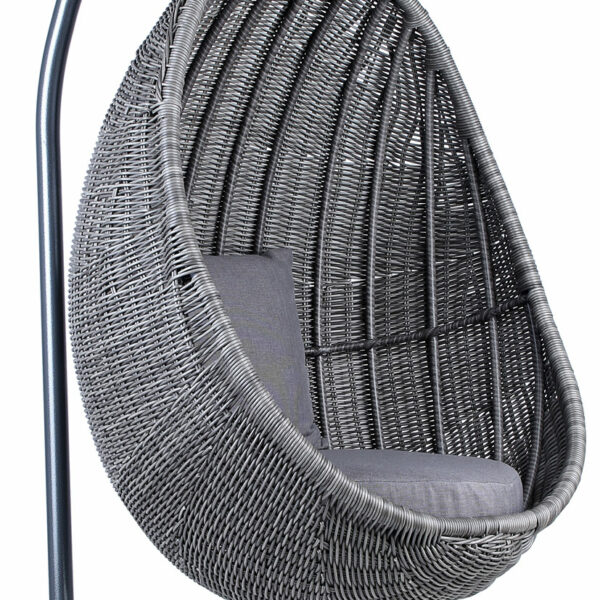 Fotel wiszący marki Oltre może pochwalić się świetnymi wymiarami wynoszącymi: 105 x 105 x 197 cm (wymiary podawane w kolejności: głębokość x szerokość x wysokość), które pozwalają wykorzystać ten mebel nawet na balkonie. Zbudowany na solidnym, odpornym na rdzę stelażu ze stali, zapewni ci doskonałą stabilność. Sam fotel o wymiarach: 125 x 90 x 90 cm został zaś wykonany z plecionki z polietylenu, która cieszy się dużą wytrzymałością na działania zmiennych warunków atmosferycznych, nie obawiając się promieniowania UV, wilgoci ani skrajnych temperatur. Dobranie takich wysokiej jakości materiałów wspaniale wpływa na długowieczność mebla, dzięki czemu przetrwa on długie lata w fantastycznej kondycji. Za to doskonałe parametry kokonu w połączeniu z wygodną poduszką siedziskową, wypełnioną pianką tapicerską, gwarantują ci niezwykły komfort użytkowania. Nienachalne wzornictwo tego szarego wiszącego fotela ogrodowego Kokon 105x197 cm oraz jego stonowana kolorystyka, tworzą elegancką całość, która będzie fenomenalną dekoracją niejednej przestrzeni.Mebel idealnie łączący w sobie funkcjonalność z cudownym designem sprawdzi się w niejednej aranżacji. Nie mamy żadnych wątpliwości, że taki wiszący fotel z technorattanu będzie doskonałym rozwiązaniem dla twojego balkonu lub tarasu. Taki ciekawy mebel pokochają zarówno dzieci, jak i docenią go też dorośli, prezentowany model z łatwością stanie się ulubionym miejscem na relaks na świeżym powietrzu wszystkich domowników. Oczywiście ta genialna propozycja sprawdzi się również w ogrodzie, ale nie ma też żadnych przeciwwskazań by wykorzystać ją do aranżacji wewnętrznych. Ten szary fotel wiszący Kokon kapitalnie zaprezentuje się w przytulnym salonie w stylu skandynawskim, gdzie pozwoli ci rozsiąść się i zrelaksować w pełnym komforcie.