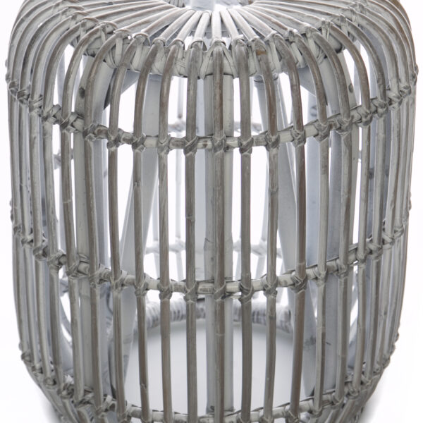Ręcznie wykonany stolik-taboret Cannes to produkt dla miłośników mebli tworzących szerokie możliwości aranżacyjne. Wykonany został w całości z naturalnego rattanu indonezyjskiego, pomalowanego na kolor czystej bieli. Subtelne, ozdobne przetarcia nadają mu charakter vintage. Stolik-taboret w stylu boho Cannes wyróżnia się ażurową, delikatną formą. Mebel przypomina pleciony lampion, gdyż włókna rattanu nie przylegają do siebie ciasno, lecz dają możliwość dostrzeżenia wewnętrznego stelaża wykonanego z czterech prostych elementów. Stolik-taboret Cannes ma wysokość 45 cm i średnicę 35 cm.