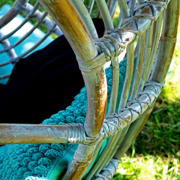 Rattanowy fotel wiszący Nice przywołuje wspomnienia huśtawek z dzieciństwa, lecz w dużo bardziej przytulnej i estetycznej formie. Pełne, półokrągłe oparcie niepostrzeżenie przechodzi w siedzisko, tworząc półzamkniętą przestrzeń, w której możesz poczuć się komfortowo. Ażurowy korpus wykonany został ręcznie z naturalnego rattanu, który ułożony jest symetrycznie w wytrzymały stelaż. Na górze inspirowanego boho fotela Nice zamontowana została pętelka pozwalająca na doczepienie łańcucha czy liny i zamocowanie mebla o wymiarach 69 cm głębokości x 77 cm szerokości x 120 cm wysokości. W komplecie występuje również praktyczny stelaż o okrągłej podstawie, który podtrzymuje mebel w górze.