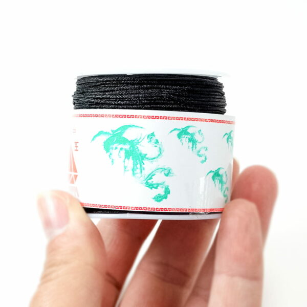 Sznurek nylonowy w kolorze czarnym, mocny, nierozciągliwy, połyskliwy. Dzięki swojej wytrzymałości rewelacyjnie sprawdzi się w technice makramy. Ten sznurek może być alternatywa dla żyłki/linki kiedy chcemy wykonać naszyjnik z dużych i ciężkich kamieni. Topliwy po delikatnym podgrzaniu łatwiej przejdzie przez otwór kamienia.