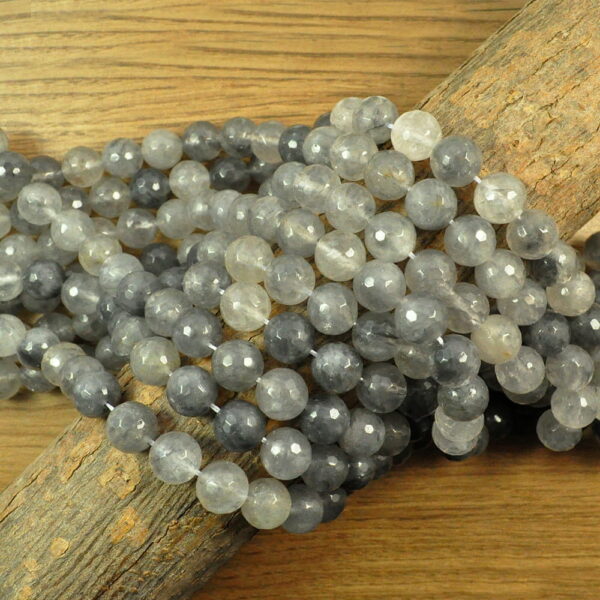 Nazwa kamienia: Kwarc szary Kształt: kula fasetowana Rozmiar: ok. 12 mm Ilość kamieni na sznurze: ok. 30 (+/-2) Długość sznura: ok. 38 cm Cena dotyczy jednego sznura