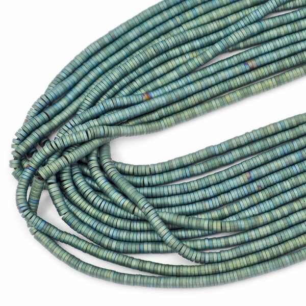 Naturalny hematyt matowy, napylany tytanem, odcienie turkusowej zieleni, kamień w kształcie walca, oponySznur wybierany jest losowo. Cena dotyczy jednego sznura o długości ok. 40 cm. Polecamy do tworzenia bransoletek i naszyjników!