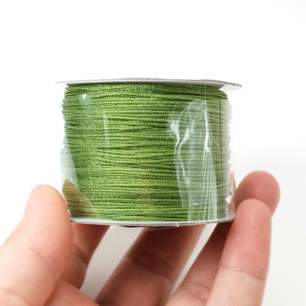 Sznurek nylonowy w kolorze zielonym, mocny, nierozciągliwy, połyskliwy. Dzięki swojej wytrzymałości rewelacyjnie sprawdzi się w technice makramy. Ten sznurek może być alternatywa dla żyłki/linki kiedy chcemy wykonać naszyjnik z dużych i ciężkich kamieni. Topliwy po delikatnym podgrzaniu łatwiej przejdzie przez otwór kamienia.