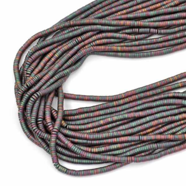 Hematyt matowy, napylany tytanem, multikolor - odcienie ciemnej zieleni i różu, kamień w kształcie walca, oponySznur wybierany jest losowo. Cena dotyczy jednego sznura o długości ok. 40 cm. Polecamy do tworzenia bransoletek i naszyjników!