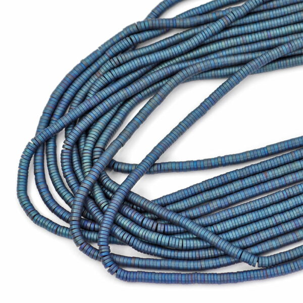 Hematyt matowy, napylany tytanem, odcienie koloru niebiesko, kamień w kształcie walca, oponySznur wybierany jest losowo. Cena dotyczy jednego sznura o długości ok. 40 cm. Polecamy do tworzenia bransoletek i naszyjników!