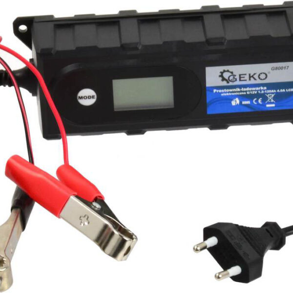 PROSTOWNIK ŁADOWARKA ELEKTRONICZNA LCD 6V/12V 4,2A GEKOAutomatyczny prostownik 4,2A GEKO do ładowania akumulatorów 6V i 12V. Ładowarka obsługuje akumulatory o pojemnościach 1.2 - 120 Ah. W prostownik wbudowano mikroprocesor, który steruje procesem ładowania. Używanie tego typu ładowarki wydłuża czas przydatności akumulatora, dzięki inteligentnemu zarządzaniu procesem ładowania przez mikroprocesor.Wyświetlacz LEDowy z podświetleniem pozwala na łatwy odczyt parametrów podczas ładowania. Woltomierz umożliwia szybką ocenę stanu naładowania baterii. Tryb zimowy pozwala na szybkie naładowanie akumulatora 12V.CHARAKTERYSTYKA:Rodzaj prostownika: automatycznyRodzaj prostownika: automatycznyProces ładowania sterowany mikroprocesoremWznowienie ładowania w przypadku spadku napięciaNiweluje zjawisko zasiarczania akumulatorówTryb zimowy dla akumulatorów o napięciu 12VMonitorowanie napięcia akumulatora po naładowaniuPrzedłuża czas eksploatacji akumulatorówZabezpieczenia: przed odwrotnym podłączeniem biegunów akumulatora, przeciw przeciążenioweZASTOSOWANIE:Akumulatory WETAkumulatory GELAkumulatory AGMAkumulatory bezobsługowe kwasowo-ołowioweDANE TECHNICZNE:Napięcie robocze: 220 - 240V / 50HzPrąd ładowania dla 12 V: 4.2APrąd ładowania dla 6 V: 0.8AMinimalna rekomendowana pojemność akumulatora 12 V: 1.2 AhMaksymalna rekomendowana pojemność akumulatora 12 V: 120 AhZakres temperatury środowiska pracy:od -10°C do +40°CCertyfikaty: CE, GS / TUV, ROHSStopień ochrony IP: IP65ZESTAW ZAWIERA:Prostownik samochodowy LCD 6V/12V 4,2A GEKO z przewodamiInstrukcję obsługiOryginalne opakowanie