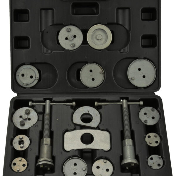 ZESTAW DO WYCISKANIA TŁOCZKÓW HAMULCOWYCH 21 ELEMENTÓW GEKOProfesjonalny 21-elementowy zestaw GEKO do cofania / wyciskania tłoczków hamulcowych, niezbędny przy naprawach pojazdów wyposażonych w hamulce tarczowe.Komplet mieści 21 różnych elementów dzięki którym z łatwością wsuniemy tłoczek w cylinder zacisku.Dzięki szerokiej gamie adapterów, obsługuje prawie każde auto.Wszystkie elementy zostały umieszczone w w wygodną, plastikową walizkę.Każdy element posiada swoje własne miejsce.ZESTAW ZAWIERA:Adapter # 0 General Motors, Cadillac Seville, EldoradoAdapter # 1 płyta mocującaAdapter # 2 Citroen XM, Xantia i inneAdapter # 3 Alfa Romeo, Audi, Austin, BMW 318 iS, 320 i, 325 TD, 518 i, 525 i, 740 i, 850 ci, M5, Ford Fiesta, Honda Concerto, Jaguar XJ6, XJ40, Mercedes-Benz 190 , 200 , 300 , 420 , 560 , Mitsubishi Colt, Nissan Micra, Stanza, Sunny, Range Rover, Toyota Camry, VW Passat, Golf GTI, VolvoAdapter # 4 Alfa Romeo 164 2.0 , Fiat, Ford Telstar, Laser, General Motors Saturn, Grand Prix, Lumina, Honda Prelude, CRX, Mazda, Saab 9000 , SubaruAdapter # 5 na grzechotkę 3/8"Adapter # 6 Nissan Primera, VW Golf 4Adapter # 7 Audi 80 oraz 90, V8 and 100 , Coupe, Ford Sierra ABS, Granada i Scorpio od 1985 , Honda Prelude, Nissan Silvia 1.8 Turbo, Blue Bird Primera 2.0 i, LS, GS, GSX, Rover 8000 , Saab 9000 , Subaru L oraz Z Peugeot 405 1 .9Gi, Gri, Sri, GTXI, MI16, 605 2.0 Sri, Toyota Celica, Corolla GT, MR2, VW Golf oraz Passat Cl, Gl, GT, GT 16V, 16V Corrado, Scirocco GTX 16V, Jetta Synchro , Jetta, GTI 16VAdapter # 8 GENERAL MOTORSAdapter # 9 General Motors, Cadillac Seville, EldoradoAdapter # A Renault R21, LagunaAdapter # E Cefrio Nissan, MaximaAdapter # F Opel Corsa, Astra, Zafira oraz VectraAdapter # K Citroen C3, C5Adapter # K1 CitroenAdapter # K2 CitroenAdapter # M FordAdapter # N Renault, Saab oraz HondaAdapter # O płyta mocującaPrasę prawoskrętną z magnetycznym mocowaniemPrasę lewoskrętną z magnetycznym mocowaniemPoręczną walizkę z tworzywa sztucznego