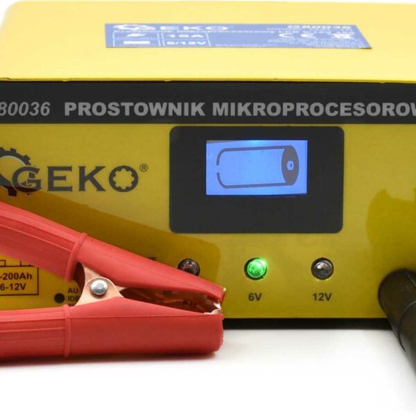 PROSTOWNIK MIKROPROCESOROWY LCD 6/12V 15A GEKOProstownik mikroprocesorowy GEKO do ładowania akumulatorów 6V i 12V. Efektywne ładowanie zapewnia 4-etapowa funkcja automatycznego ładowania.Pozwala na ładowanie akumulatorów prądem o natężeniu od 0A do 15A. Nezwykle wysoka efektywność ładowania w temperaturach dodatnich. Dzięki zaawansowanej technologi sterowania wszystkimi procesami ładowania, efektywność prostownika utrzymuje się na poziomie 98%.Urządzenie wyposażone zostało w czytelny podświetlany wyświetlacz LCD, który wyświetla m.in. stan naładowania akumulatora.CHARAKTERYSTYKA:Technologia modulacji szerokości impulsu - Pulse-Width Modulation (PWM)Wskaźnik naładowania bateria wyświetla cztery wartości: 20%, 50%, 75%, 100%Szereg zabezpieczeń gwarantujących bezpieczne bezobsługowe korzystanie z prostownikaElektronicznie sterowany wentylator - Technologia MCUŁadowanie prądem 0A - 15A3 diody sygnalizująceCzytelny wyświetlacz LCDZastosowanie do akumulatorów: kwasowo-ołowiowych, rozruchowych, bezobsługowychZabezpieczenia: ochrona przeciwprzepięciowa, funkcja diagnostyki akumulatora, zabezpieczenie przed przegrzaniem, ochrona przed zwarciem, ochrona przed odwrotnym podłączeniemDANE TECHNICZNE:Napięcie robocze: 220 - 240V / 50HzIdentyfikacja napięcia dla 6V: 2V - 7,4VIdentyfikacja napięcia dla 12V: 8V - 14,5VNatężenie ładowania: 15APojemność akumulatorów 6V/12V: 6Ah - 200AhDługość przewodu zasilającego: 130cmDługość przewodów "+" i "-": 140cmWaga: 1 kgZESTAW ZAWIERA:Prostownik mikroprocesorowy GEKO z przewodamiInstrukcję obsługiOryginalne opakowanie