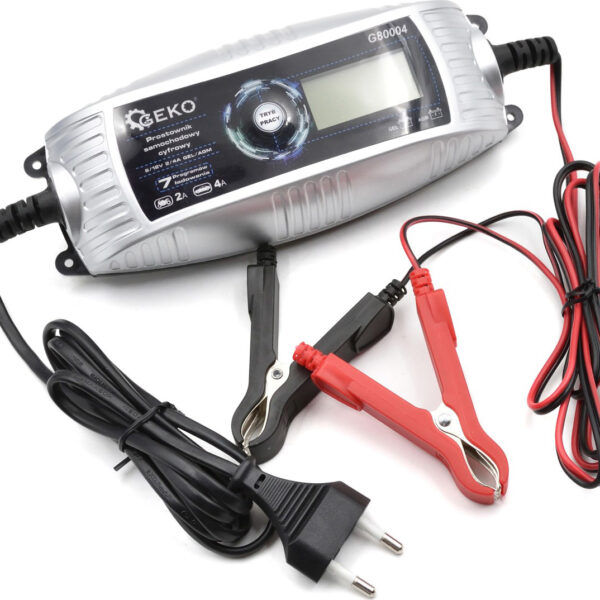 PROSTOWNIK SAMOCHODOWY CYFROWY 6/12V 2/4A GEL/AGM GEKOAutomatyczny prostownik cyfrowy 4A (ładowarka) renomowanej marki narzędziowej GEKO. Urządzenie przeznaczone do ładowania akumulatorów AGM i GEL 6V oraz 12V o pojemności od 1,2Ah do 120Ah. Ładowarka dedykowana do akumulatorów stosowanych w samochodach, motocyklach, motorowerach, skuterach wodnych, a także jachtach.Urządzenie posiada czytelny wyświetlacz LCD, wbudowany woltomierz oraz 7 trybów pracy. Inteligentne ładowanie sterowane mikroprocesorem, po pełnym naładowaniu przełącza się w tryb monitorowania napięcia i w przypadku spadku napięcia doładowuje akumulator. Jest to rozwiązania w 100% bezpieczne dla każdego akumulatora.7 TRYBÓW PRACY (należy wybrać odpowiedni tryb pracy do posiadanego akumulatora):1. Dla akumulatorów 6V o pojemności do 14Ah - temperatura otoczenia powyżej 0ºC - napięcia naładowanego akumulatora 7,2V2. "Tryb zimowy" dla akumulatorów 6V o pojemności do 14Ah - temperatura otoczenia poniżej 0ºC - napięcia naładowanego akumulatora 7,4V3. Dla akumulatorów 12V o pojemności do 14Ah - temperatura otoczenia powyżej 0ºC - napięcia naładowanego akumulatora 14,3V4. "Tryb zimowy" dla akumulatorów 12V o pojemności do 14Ah - temperatura otoczenia poniżej 0ºC - napięcia naładowanego akumulatora 14,7V5. Dla akumulatorów 12V o pojemności od 14Ah do 120Ah - temperatura otoczenia powyżej 0ºC - napięcia naładowanego akumulatora 14,3V6. "Tryb zimowy" dla akumulatorów 12V o pojemności do 14Ah do 120Ah - temperatura otoczenia poniżej 0ºC - napięcia naładowanego akumulatora 14,7V7. Tryb "reaktywacji/reanimacji"- specjalny tryba ładowania, który załącza się automatycznie w momencie wykrycia skrajnie rozładowanego akumulatoraCHARAKTERYSTYKA:Wysoka jakość wykonaniaInteligentne ładowanie sterowane mikroprocesoremTryb monitorowania napięcia w przypadku spadku napięcia doładowuje akumulatorPosiada specjalny tryba ładowania, który załącza się automatycznie w momencie wykrycia skrajnie rozładowanego akumulatora, ładowanie odbywa się impulsowo przy użyciu prądu o niskim natężeniu, po osiągnięciu odpowiedniego poziomu naładowania urządzenie przełącza się w tryb szybkiego ładowaniaPrzeznaczony do akumulatorów samochodowych, motocyklowych oraz do akumulatorów stosowanych w motorowerach, skuterach wodnych, a także jachtachŁadowarka posiada szereg zabezpieczeń m.in.: przed błędnym podłączeniem biegunów, przed przegrzanie, zwarciem, przeciążeniem, przeładowaniemDANE TECHNICZNE:Napięcie zasilania: 230V~50hZNapięcie wyjściowe: 6/12VMaksymalne napięcia ładowania:- dla akumulatorów 6V - 7,4V- dla akumulatorów 12V - 14,7VMaksymalny prąd ładowania:- 2A +/- 10%- 4A +/- 10%Obsługiwana pojemność akumulatorów:- 6V - 1,2Ah do 14Ah- 12V - 1,2Ah do 120AhZESTAW ZAWIERA:Prostownik cyfrowy samochodowy GEKOPrzewody ładująceInstrukcję obsługiOryginalne opakowanie