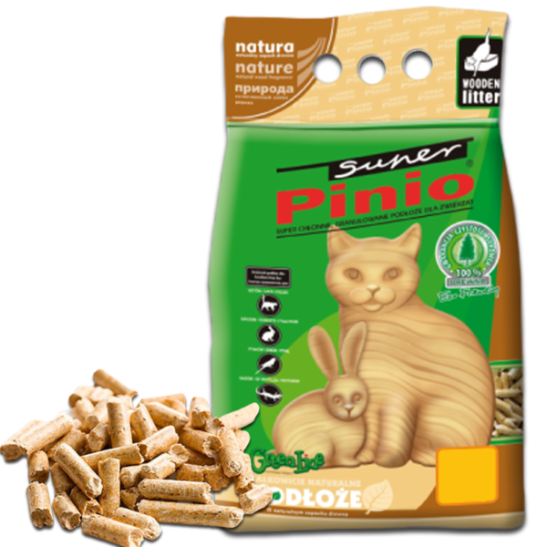Super Pinio PELLET NATURALNYPodłoże posiada naturalne aromaty drewna sosnowego lub świerkowego, które tworzą wokół kuwety przyjemny odświeżający zapach. Żwirek Super Pinio Pellet to niezbrylające podłoże dla zwierząt domowych wykonane w 100% z naturalnego drewna drzew iglastych – mikrowłókien drzew sosnowych i świerkowych, bez dodatków chemicznych. Posiadają bardzo wysoką wchłanialność oraz doskonale wiążą zapachy. Produkty występują w postaci granulatu o kształcie wałeczków o średnicy 6 mm. Są przyjazne dla środowiska i zwierząt, a także w 100% biologicznie odbudowywalne. Można je z łatwością usuwać drogą sanitarną. Zużyte granulki rozpadają się, co pozwala określić stan wyeksploatowania żwirku. Wyroby zapewniają komfort stosowania, gdyż nie wymagają od właściciela częstej ingerencji.Opakowanie 35L