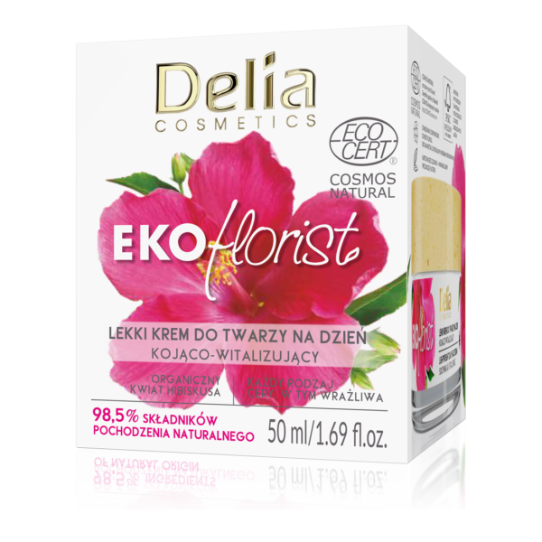 Delia EKOFlorist Lekki Krem Do Twarzy Na Dzień Kojący WitalizującyLinia EKOflorist zawiera kosmetyki certyfikowane, wegańskie i ze składnikami pochodzenia naturalnego – w tym drogocennymi ekstraktami kwiatowymi – z hibiskusa, lotosu, bławatka, lnu, malwy. 98,5% składników pochodzenia naturalnego. Bez składników pochodzenia zwierzęcego. Subtelna kompozycja zapachowa pochodzenia naturalnego. Efekty dla Twojej skóry: 92% zapewnia odczucie intensywnego nawilżenia. 96% daje efekt wygładzenia. 92% sprawia, że skóra staje się bardziej miękka w dotyku. 96% zapewnia odczucie odżywienia, sprawiając, że cera wygląda na bardziej witalną. 96% przywraca blask i wyrównuje koloryt skóry. 84% sprawia, że skóra staje się bardziej elastyczna w dotyku. 80% koi podrażnienia.Poznaj ekologiczny ekstrakt z hibiskusa! Antocyjany – zapobiegają rozwojowi wolnych rodników. Kwasy organiczne – przywracają blask i wyrównują koloryt cery. Cukry: glukoza, fruktoza, sukroza – wykazują działanie nawilżające.Pojemność: 50ML