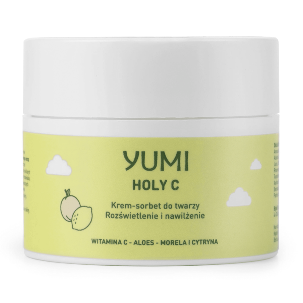 Yumi Holy C Rozświetlenie I Nawilżenie Krem Sorbet Do TwarzyYumi Holy C to krem-sorbet do pielęgnacji twarzy o właściwościach rozświetlających i nawilżających. Jego formuła jest wegańska, a 95% to składniki pochodzenia naturalnego. Może być stosowany na dzień i/lub na noc. Sprawdzi się pod makijaż. Posiada lekką konsystencję, która dobrze się aplikuje, szybko wchłania i nie obciąża skóry. W recepturze znajdują się takie składniki aktywne jak - witamina C, która jest świetnym rozwiązaniem dla osób borykających się z przebarwieniami skóry, dodatkowo wyrównuje jej koloryt i wzmacnia naskórek. Aloes zapewnia nawilżenie i łagodzi podrażnienia, a owocowe ekstrakty (morela i cytryna) odświeżają i orzeźwiają skórę.nawilżawyrównuje koloryt skóryrozjaśnia przebarwieniarozświetla95% składników pochodzenia naturalnegowegański99% sok z liści aloesu100% wegańskiPojemność: 50ML
