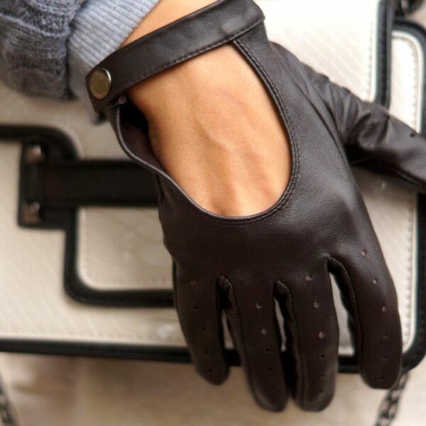 Damskie, nieocieplane rękawiczki samochodowe z technologią touchscreen wykonane z naturalnej owczej skóry.
