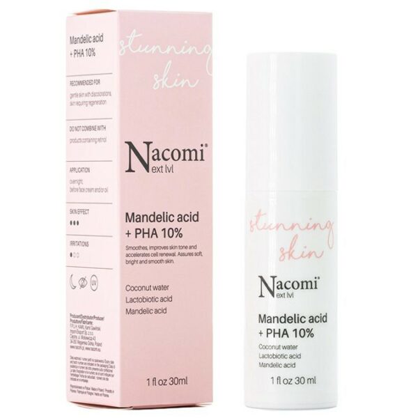 Nacomi Next Level Peelingujące Serum Z Kwasem Migdałowym I Kwasami PHA 10%Nacomi - Next Level - Peelingujące Serum z Kwasem Migdałowym i Kwasami PHA 10% - w swoim składzie zawiera kwas migdałowy, który działa keratolitycznie, ogranicza produkcję sebum, a także wspomaga redukcję stanów zapalnych oraz kwasy PHA - laktobionowy i glukonolakton, które wyrównują koloryt skóry oraz działają nawilżając. Ponadto dodatek ekstraktu z migdałów i wody kokosowej działa wygładzająco i zmiękczająco na skórę. Produkt zawiera: kwas migdałowy - działa keratolitycznie, ogranicza produkcję sebum, a także wspomaga redukcję stanów zapalnych,kwasy PHA - laktobionowy i glukonolakton, wyrównują koloryt skóry oraz działają nawilżającoekstrakt z migdałów i wodę kokosową - działają wygładzająco i zmiękczająco na skórę. Działanie produktu:złuszczające,wygładzające,ograniczające produkcję sebum.Rodzaje skór oraz defekty kosmetyczne, dla których ten produkt może być pomocny:skóra tłusta,skóra mieszana,skóra problematyczna,skóra z oznakami starzenia,skóra z przebarwieniami.Sposób aplikacji: Niewielką ilość produktu zaaplikuj wieczorem na oczyszczoną skórę twarzy. Delikatnie wmasuj i pozostaw do całkowitego wchłonięcia. Podczas kuracji stosuj na dzień krem z filtrem SPF50. Pojemność: 30ML