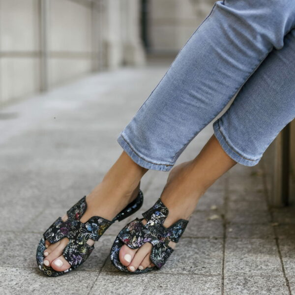 damskie klapki na miękkiej podeszwie - skóra naturalna - model 371 - kolor czarne kwiaty