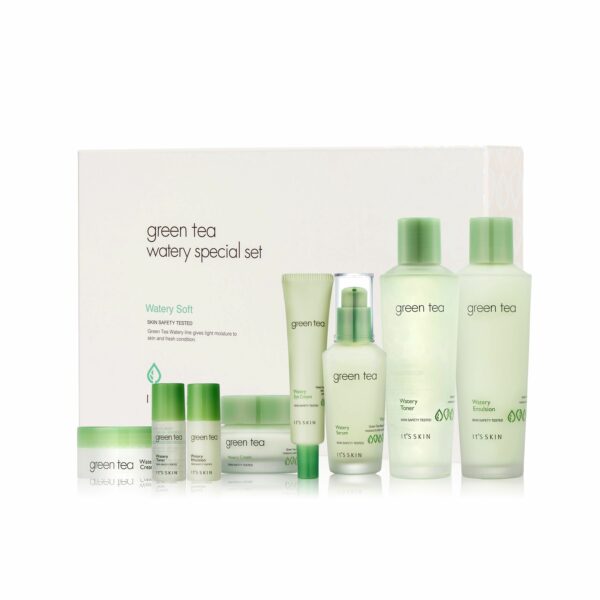 Kompleksowy zestaw kosmetyków It'S SKIN zawierających ekstrakt z zielonej herbaty.