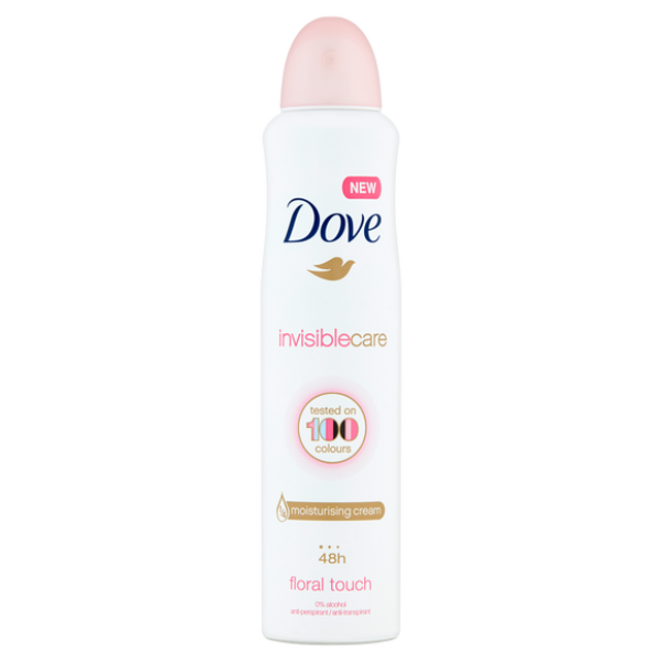 Dove Invisible Care Floral Antyperspirant Spray Damski 150MLPreparat do walki z potem i nieprzyjemnym zapachem. Skuteczny w swoim działaniu , a dzięki zawartości 1/4 kremu nawilżającego dba o kondycje i zapobiega przesuszaniu skóry. Antyperspirant nie pozostawia białych śladów, co zostało przetestowane na próbce 100 kolorów. Miękka skóra pod pachami, brak białych śladów i skuteczna ochrona, to wszystko czego potrzebujesz!Właściwości antyperspirantu Dove Invisible Care Floral Touch 48h:Nie zostawia białych śladówSkuteczna ochrona przed potemDziała nawet 48hZawiera krem nawilżającySposób użycia: Aplikuj na czystą i suchą skórę pod pachami.