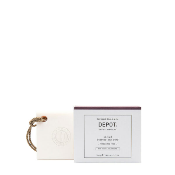 Depot 602 Scented bar soap - original OUD czyli mydło w kostce do mycia ciała o zapachu OUD.Urzekające zapachem OUD mydło jest bogate w składniki pielęgnujące i odżywiające męską skórę. W przeciwieństwie do wielu mydeł do ciała przyjemnie się pieni - wtedy też pachnie najmocniej. Aby ułatwić korzystanie z mydła producent dodał do niego funkcjonalny sznurek.Cechy charakterystyczne:Kompleks botaniczny, mieszanka 10 ekstraktów roślinnych o niezwykle korzystnym wpływie na skóręErytrytol, środek utrzymujący wilgoć, pomaga zachować miękkość i elastyczność skóryGliceryna, środek utrzymujący wilgoć, utrzymuje prawidłowy poziom nawilżeniaPojemność: 100gZapach: Original OUD with spicy and slightly floral fragrance. Zapach OUD wzbogacony o nuty kwiatowe.Sposób użycia: Do mycia należy delikatnie zwilżyć mydło i spieniać je w rękach lub bezpośrednio na gąbce do mycia.