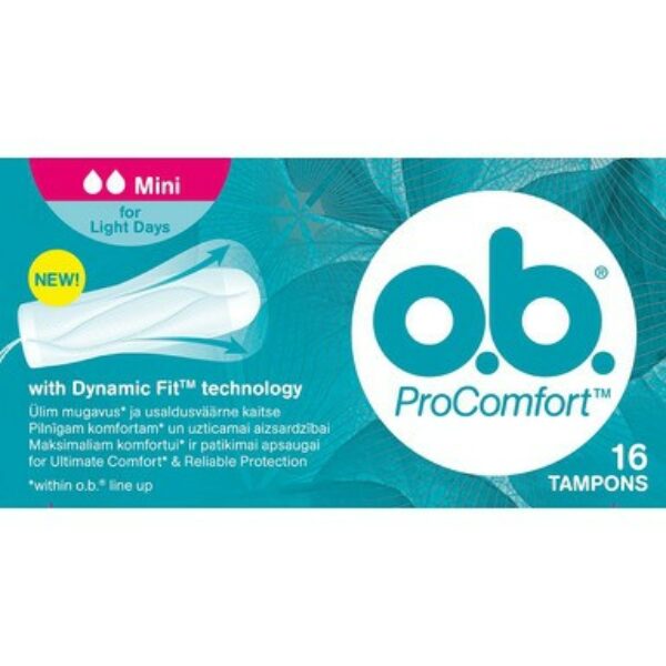 O.B. ProComfort Tampony Mini 16 SztukTampony o.b. ProComfort zapewniają łatwą aplikację dzięki otoczce SilkTouch oraz niezawodną ochronę dzięki rewolucyjnej technologii DynamicFit z 3D expansion, dzięki której tampon o.b. dostosowuje się do twojego ciała i efektywnie wychwytuje płyn, kierując go poprzez splecione rowki do wnętrza i w górę tamponu.Tampony są bardzo małe, wąskie i mają smukłą końcówkę, przez co łatwo je zaaplikować.Dzięki temu są bardzo proste i wygodne w użyciu nawet w dni słabszego krwawienia oraz gdy dopiero zaczynasz stosować tampony.Tampony o.b. ProComfort Mini są odpowiednie w dniach słabego lub umiarkowanie intensywnego krwawienia oraz dla dziewcząt zaczynających używać tamponów.