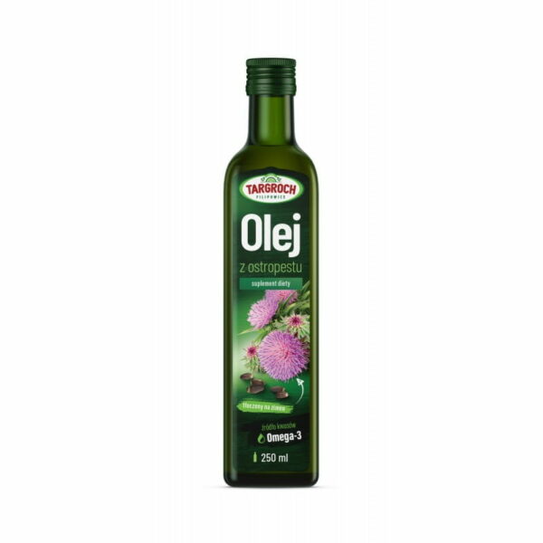 Olej z ostropestu tłoczony na zimno - Suplement diety Olej z ostropestu uzyskany z najwyższej jakości nasion ostropestu powstaje metodą tłoczenia na zimno. Olej z ostropestu stanowi źródło kwasów tłuszczowych Omega-3. Składniki Olej z ostropestu plamistego tłoczony na zimno. Zastosowanie Olej z ostropestu zalecany jest dla osób dorosłych w celu uzupełnienia diety w wielonienasycone kwasy tłuszczowe. Doskonale nadaje się do sałatek , surówek oraz innych dań serwowanych na zimno. Na oleju z ostropestu tłoczonym na zimno nie należy podgrzewać ani smażyć potraw. Zalecana dzienna porcja 10 ml (ok. 2 łyżeczki ) Sposób użycia Zaleca się stosować 2 razy dziennie po 1 łyżeczce oleju. Dodatkowe informacje Nie należy przekraczać zalecanej porcji w ciągu dnia .Suplementy diety nie mogą być stosowane jako substytut (zamienniki)zróżnicowanej diety. Tylko zdrowy tryb życia i zrównoważony sposób odżywiania zapewniają prawidłowe funkcjonowanie organizmu. Przeciwwskazania Produkt nie może być stosowany przez osoby uczulone na którykolwiek z jego składników. Przechowywanie Przechowywać w miejscu suchym, chłodnym i zacienionym, niedostępnym dla małych dzieci. Po otwarciu przechowywać w temperaturze 4 - 10 st.C nie dłużej niż 3 - 4 tygodnie. Może wytrącić się naturalny osad lub zmętnienie - jest to zjawisko naturalne, które nie wpływa na wartość odżywczą oleju. Wartości odżywcze Wartość odżywcza produktu W 100 g W porcji 10 g %RWS* w 10 g Wartość energetyczna 3449 kJ / 824 kcal 345 kJ / 82 kcal 4 % Tłuszcz w tym kwasy tłuszczowe nasycone jednonienasycone kwasy tłuszczowe wielonienasycone kwasy tłuszczowe 91,6 g 13,6 g 71,7 g 6,3 g 9,16 g 1,36 g 7,17 g 0,63 g 13 % 7 % - - Węglowodany w tym cukry 0 g 0 g 0 g 0 g 0 % 0 % Błonnik 0 g 0 g - Białko 0 g 0 g 0 % Sól** 0 g 0 g 0 % Omega-3 0,64 g 0,06 g - Omega-6 5,95 g 0,60 g - Możliwe naturalne odchylenia.**Zawartość soli wynika wyłącznie z obecności naturalnie.*RWS – Referencyjne Wartości Spożycia przeciętnej osoby dorosłej (8400kJ/2000kcal). UWAGA - zdjęcie / wizualizacja produktu może odbiegać od aktualnego wyglądu. Indeks