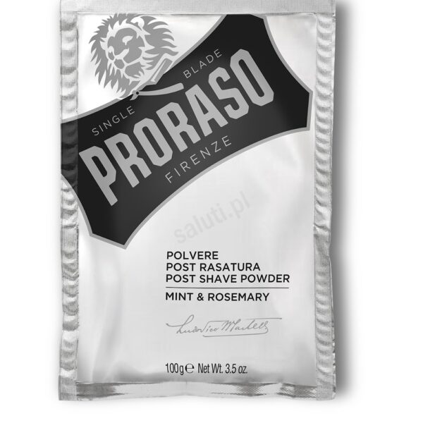 Proraso mięta i rozmaryn puder po goleniu - to produkt, który usuwa resztki wody po goleniu. Redukuje podrażnienia, zmiękcza i osusza skórę. Posiada delikatny efekt matujący.Sposób użycia: Niewielką ilość pudru nasypać na dłonie i delikatnie wmasować w ogoloną i osuszoną twarz. Może być stosowany zarówno przed, jak i po użyciu wody po goleniu.Zapach: Mięta, rozmaryn, goździk oran nuty trway wetiwer.Uwagi: Produkt nie zawiera olejków mineralnych, sztucznych barwników, silikonów oraz paranbenów!Opakowanie: 100g
