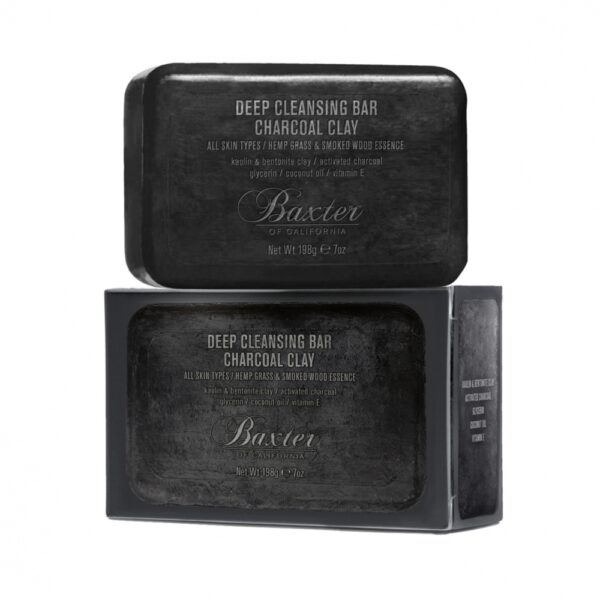 Baxter of California Deep Cleansing Bar Charcoal Clay to czarna kostka mydła 3w1, która detoksykuje skórę i jej nie wysusza. Zawiera glinkę kaolinową i bentonitową wraz z aktywowanym węglem drzewnym, które usuwa nadmiar sebum, brud i zanieczyszczenia z twarzy, brody i ciała. Po głębokim oczyszczeniu, zawarty w nim olej kokosowy nawilża skórę -i pozostawia uczucie ukojenia. Polecany dla: codziennej pielęgnacji skóry ciała i twarzy. Sposób użycia: wmasować w wilgotną skórę do momentu powstania bogatej piany. Dokładnie spłukać. Pojemność: 198g. Skład INCI: SODIUM PALMATE, SODIUM PALM KERNELATE, AQUA / WATER, GLYCERIN, PARFUM / FRAGRANCE, SODIUM GLUCONATE, MARIS LIMUS EXTRACT / SEA SILT EXTRACT, COCOS NUCIFERA OIL / COCONUT OIL, CHARCOAL POWDER, PALM ACID, SODIUM CHLORIDE, BENTONITE, PALM KERNEL ACID, RICINUS COMMUNIS SEED OIL / CASTOR SEED OIL, KAOLIN, TOCOPHERYL ACETATE, SALVIA SCLAREA OIL / CLARY OIL